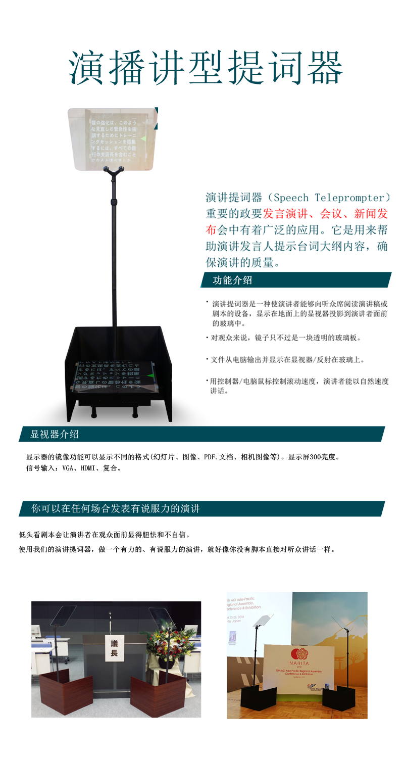 提词器屏幕采用广视角高清分辨率LED屏幕,提供VGA、HDMI双输入接口,可直接连接PC实现播音文稿,提词屏幕视角可达水平140°和垂直130°,250cd/m2亮度标准屏。