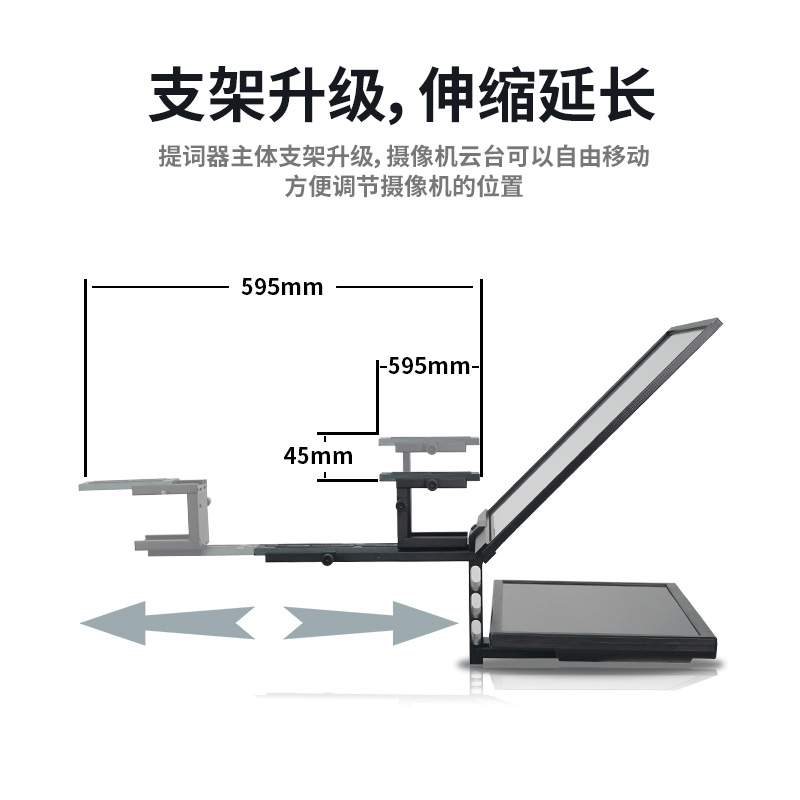提词器框和托板采用手拧设计,安装方便,多档位安装方式,用户可根据需要,上下调整镜像屏与提词器框的角度,前后摄像机与提词器框的距离和上下调整摄像机高度等。