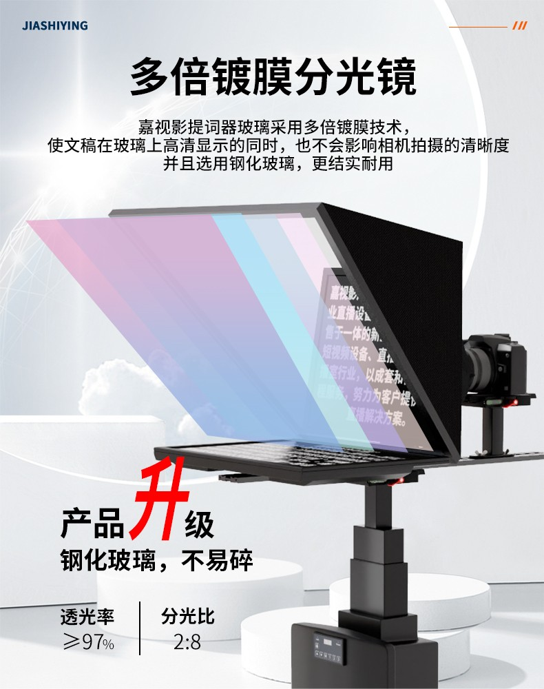 采用2mm专业镀膜无色分光镜,多介质膜无色差超薄增透分光镜,防眩光高亮显示技术,透过率超过85%以上,分光比2:8光损失小于3%,透反率1:0.35提示器文稿显示清晰,无虚影,拍摄不穿帮。