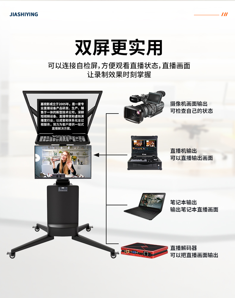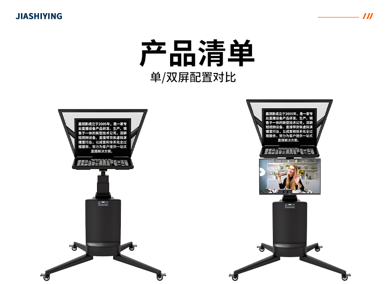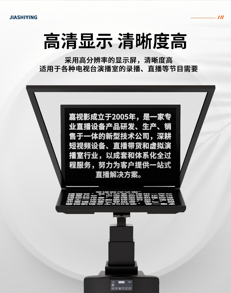 提词器屏幕采用广视角高清分辨率LED屏幕,提供VGA、HDMI双输入接口,可直接连接PC实现播音文稿,提词屏幕视角可达水平140°和垂直130°,250cd/m2亮度标准屏。