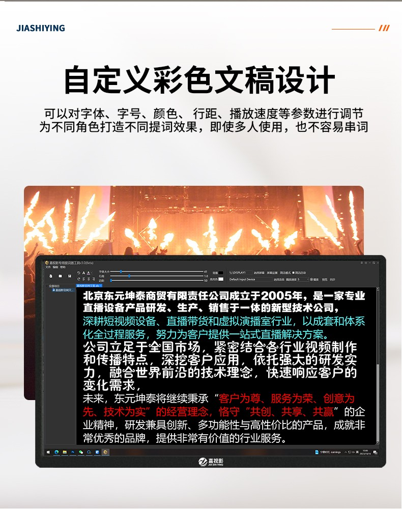 2、支持镜像、多人分色播出,不同主持人可设置字色背景色进行区分,滚动速度任意调整,字号、字体、字色、背景色任意搭配等功能;