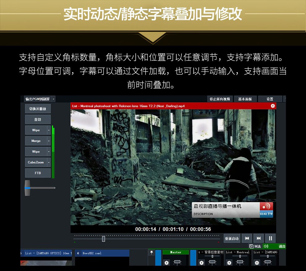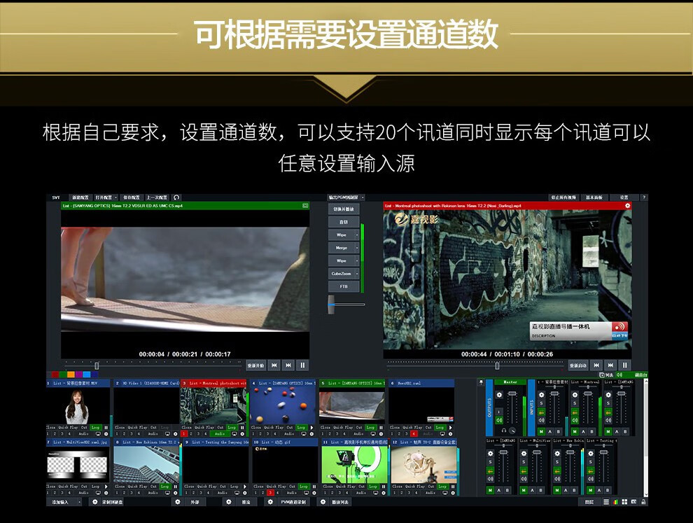 嘉视影9900导播台,是一款直播导播推流抠像一体化设备,把传统的显示屏,字幕机,调音台,非线性编辑,直播推流器,实时抠像机,虚拟演播室等所有的功能集成一体,内置森然DJ声卡,自带嘉视影LiveMagic虚拟导播软件,功能丰富操作简单,是一款性价比极高,适合各类人群的一款直播导播推流抠像一体化设备。